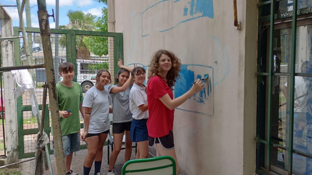 Uno de los objetivos del proyecto fue que los alumnos de la escuela pudieran involucrarse activamente. Al respecto, Lorena contó: “Trabajamos en el armado del mural con la orientación de arte, bajo la dirección de la profesora Florencia Collomb. Los artistas, Jorge Zárate y Mauro Sánchez, de manera muy generosa, estuvieron dispuestos a trabajar con nuestros estudiantes más pequeños del ciclo básico en la intervención de parte del mural, y también con los chicos del ciclo orientado, abordando temas como las obras de arte contemporáneo. Fue una propuesta bastante interesante para nosotros, dentro de los proyectos formativos. Los estudiantes estuvieron muy felices y contentos con la participación.”