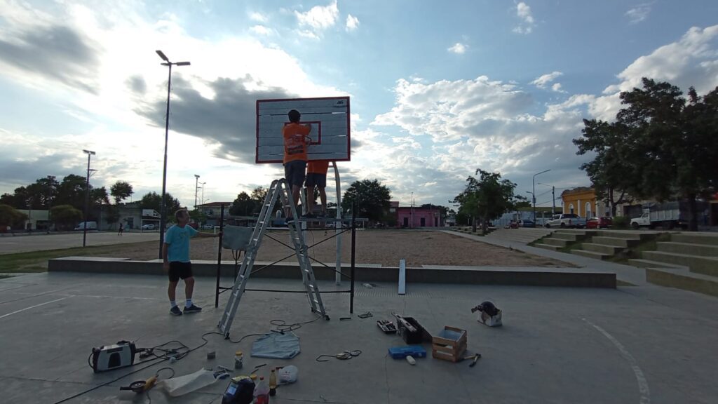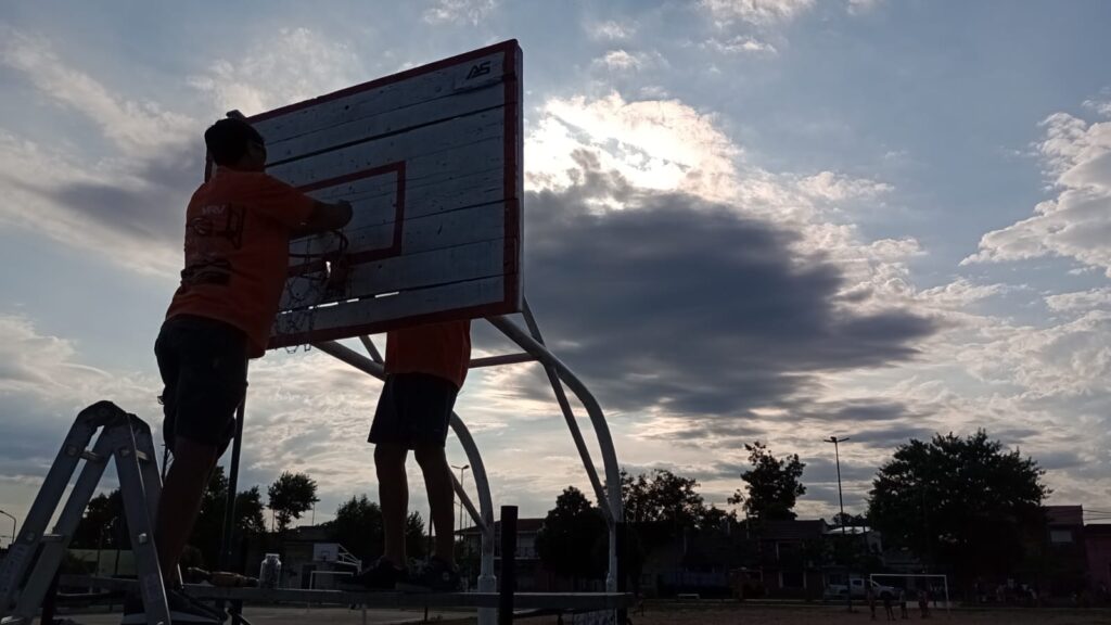 Eduardo Jacobo está soldando subido a un andamio negro, identificado con el logo de “Vale, recontravale”, el nombre con el que este grupo de amigos viene dándole vida a canchas que no tenían redes, aros o incluso los tableros y/jirafas estaban rotas.