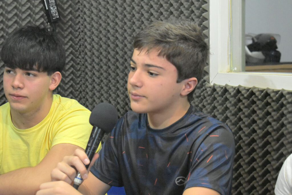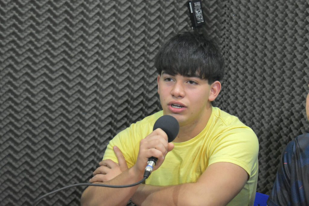 El primero en tomar el micrófono fue el más grande de los cuatro pesistas, Juan Pablo Capovila. Tiene 16 años, está cursando quinto año en la escuela Normal Superior N°15 “Domingo Faustino Sarmiento” y practica este deporte hace varios años, respecto a eso expresó: “hace algunos años empezamos con Guille desde cero y ahora estamos con los chicos. Con Justo e Inés nos vamos al Nacional, después de estar tanto tiempo solo entrenando, tener unos compañeros para entrenar y viajar es lindo”.