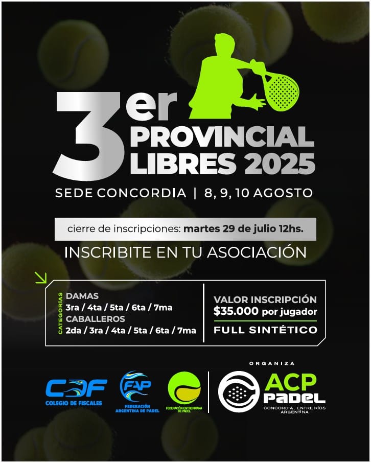 Del 8 al 10 de agosto, Concordia será sede de la Tercer Fecha del Provincial de Libres, el certamen más convocante que tendrá la ciudad este año, que organiza la Federación Argentina de Pádel (FAP) con la Federación Entrerriana de Pádel. “Estoy muy contento de poder comunicar que ya está todo armado y publicado”, marcó en el diálogo con “3200, el código del deporte”.