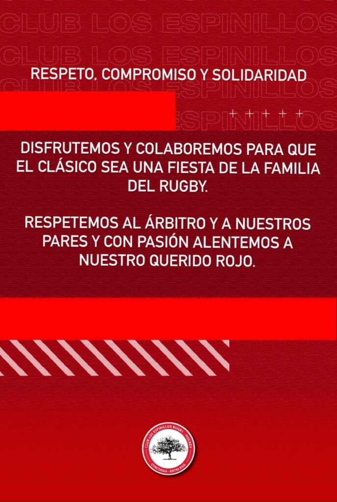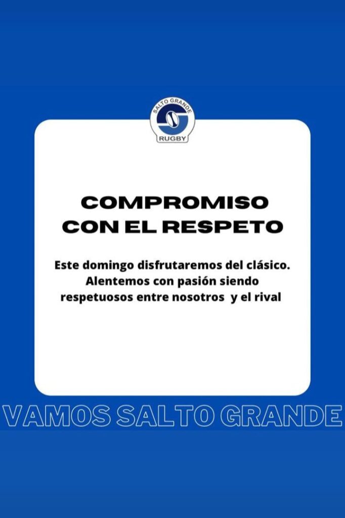 “Compromiso con el respeto. Disfrutemos del clásico. Alentemos con pasión siendo respetuosos entre nosotros y el rival”, manifestó Salto Grande en sus redes sociales mientras que el “Rojo” publicó: “Respeto, compromiso y solidaridad. Disfrutemos y colaboremos para que el clásico sea una fiesta de la familia del rugby. Respetemos al árbitro y a nuestros pares y con pasión alentemos a nuestro querido rojo”.