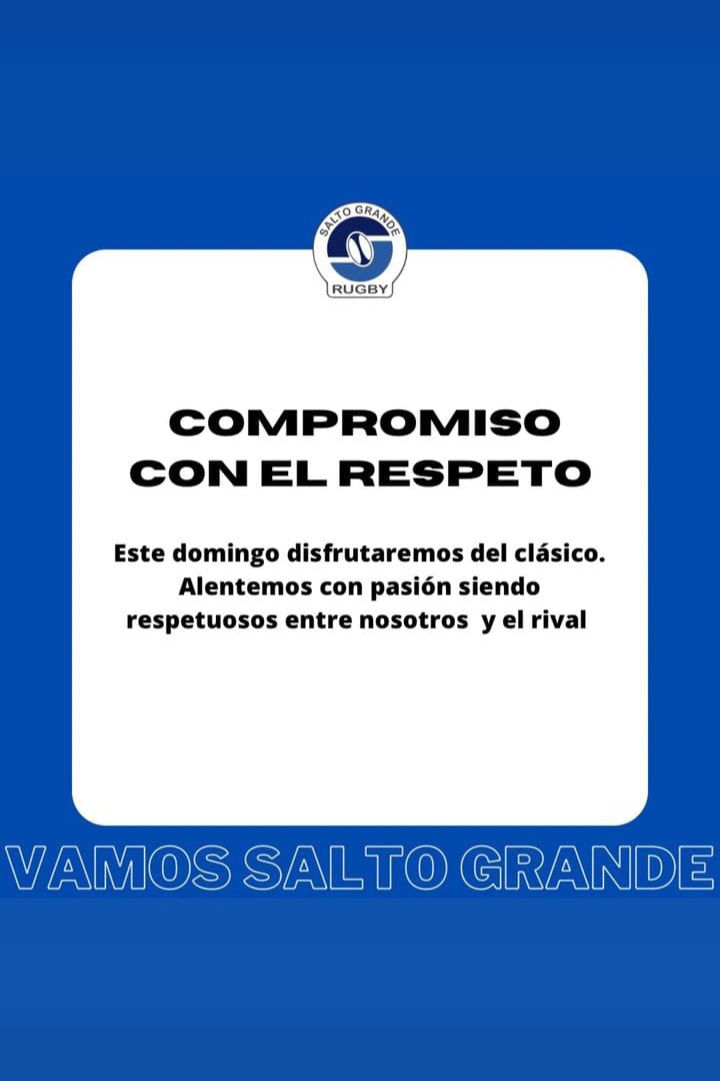 “Compromiso con el respeto. Disfrutemos del clásico. Alentemos con pasión siendo respetuosos entre nosotros y el rival”, manifestó Salto Grande en sus redes sociales mientras que el “Rojo” publicó: “Respeto, compromiso y solidaridad. Disfrutemos y colaboremos para que el clásico sea una fiesta de la familia del rugby. Respetemos al árbitro y a nuestros pares y con pasión alentemos a nuestro querido rojo”.